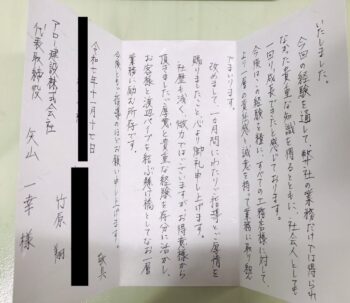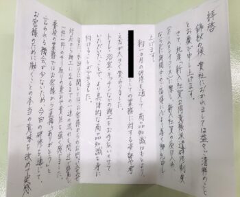 後日、上司の方と「お礼状」を持参してくれました!
