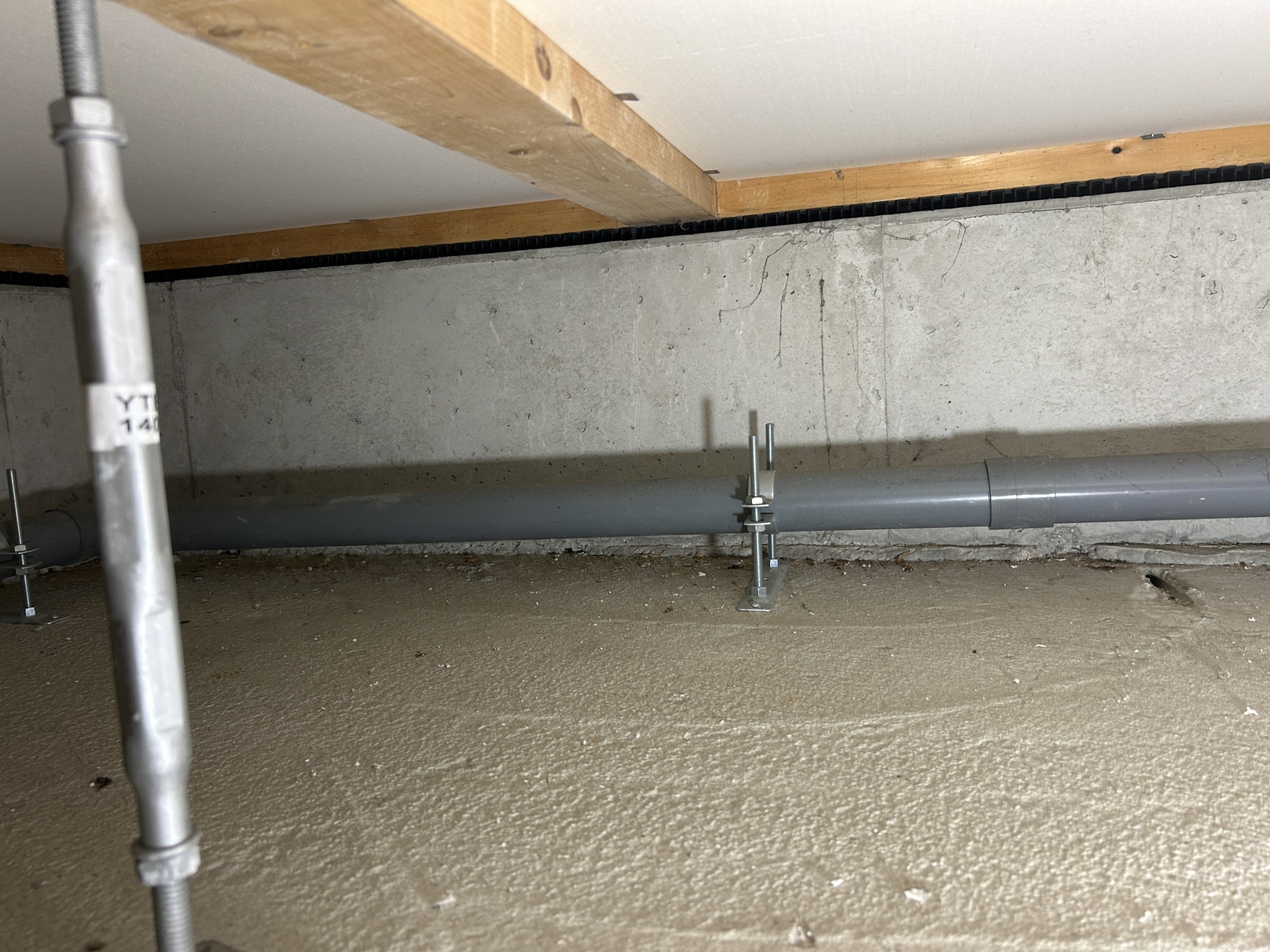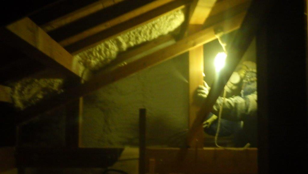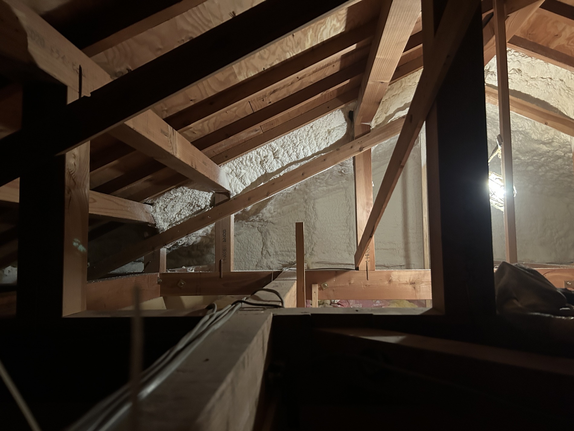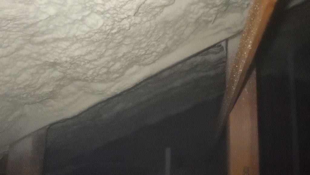 <断熱> 屋根の吹き付け断熱を施工しました。新築時、 天井裏・壁・床下の断熱がされていましたが、屋根からの熱を防ぐためにも、屋根の野地板に吹き付ける断熱を施工しました。天井裏は2重の断熱となり、最近の酷暑への対応も大きく改善されました。