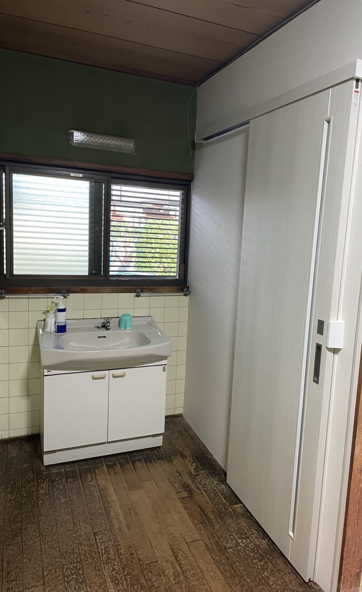 中扉を撤去し、トイレ内の間仕切り壁を300mm程にしました。男性用と女性用のトイレが2ケありましたが、トイレを1ケにし、男性用トイレがあった所に、「手洗器」を設置しました。