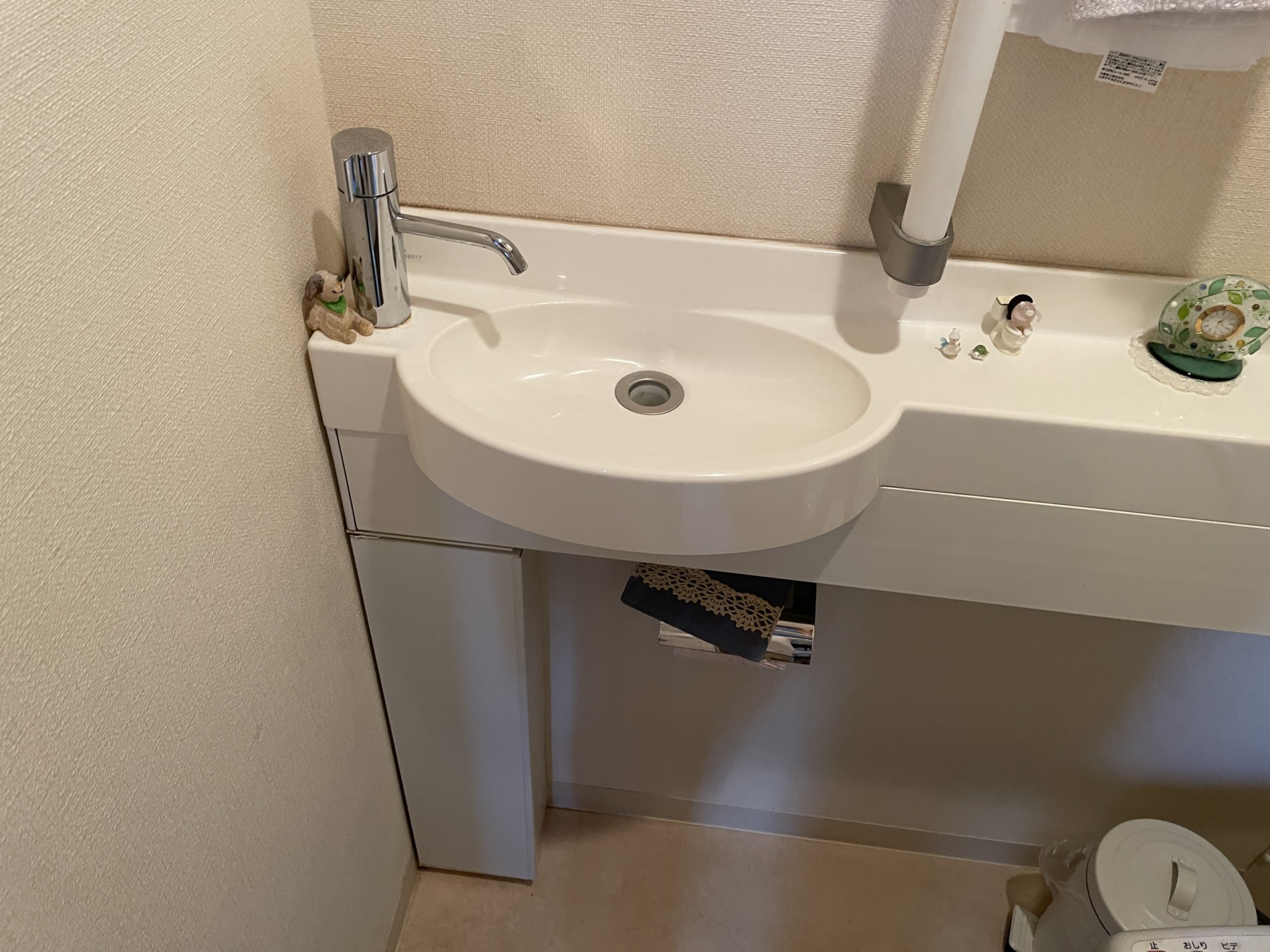 長年ご利用のトイレで、便器と便器と別の手洗器が正面左にありました。