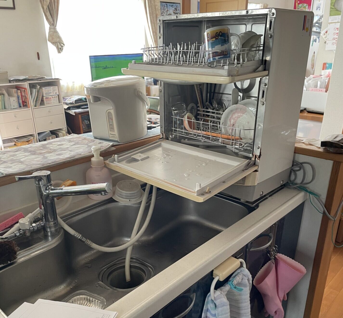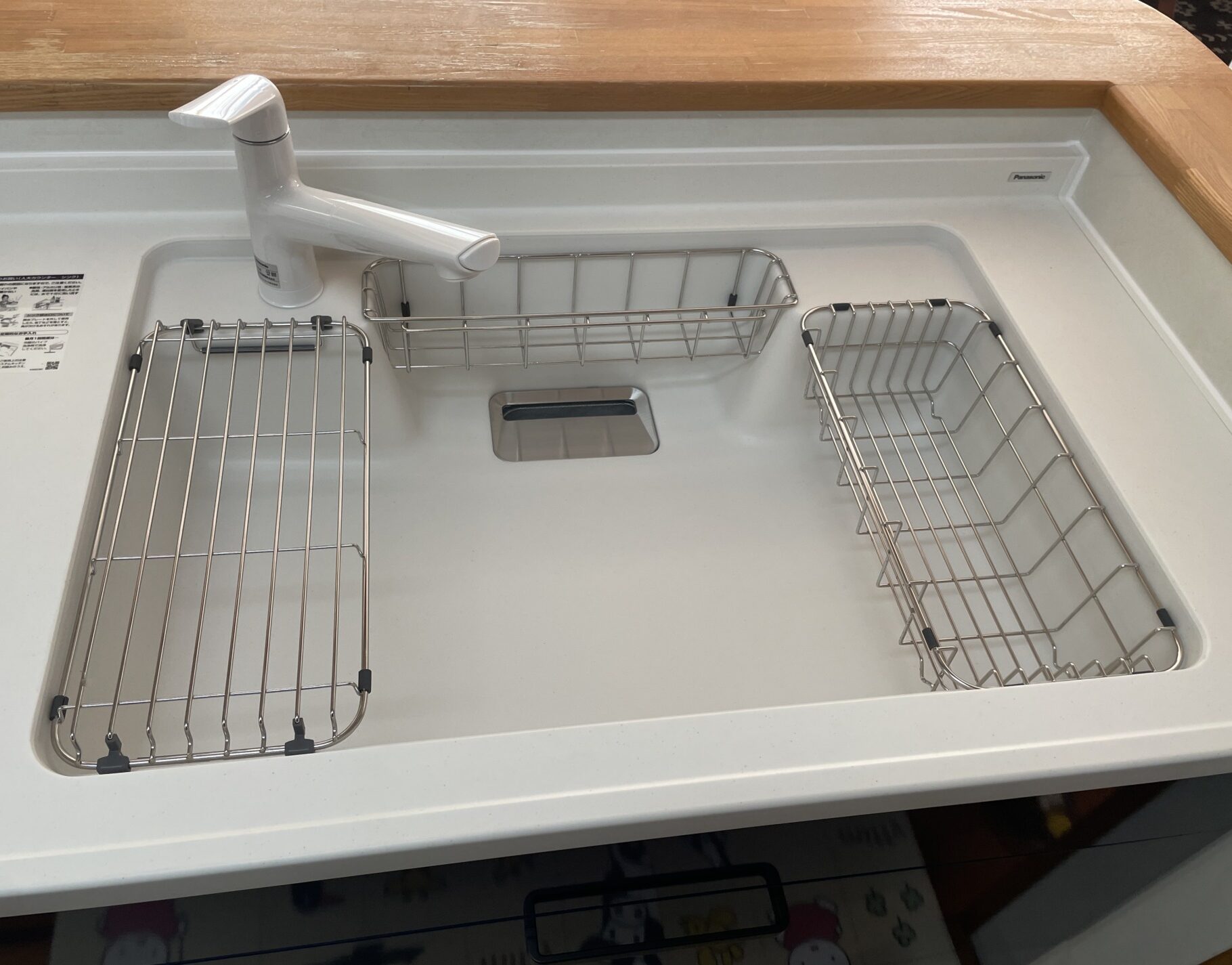 人大キッチンで美しいです♪シンク左:クッキングネット、シンク右:水切りカゴです。