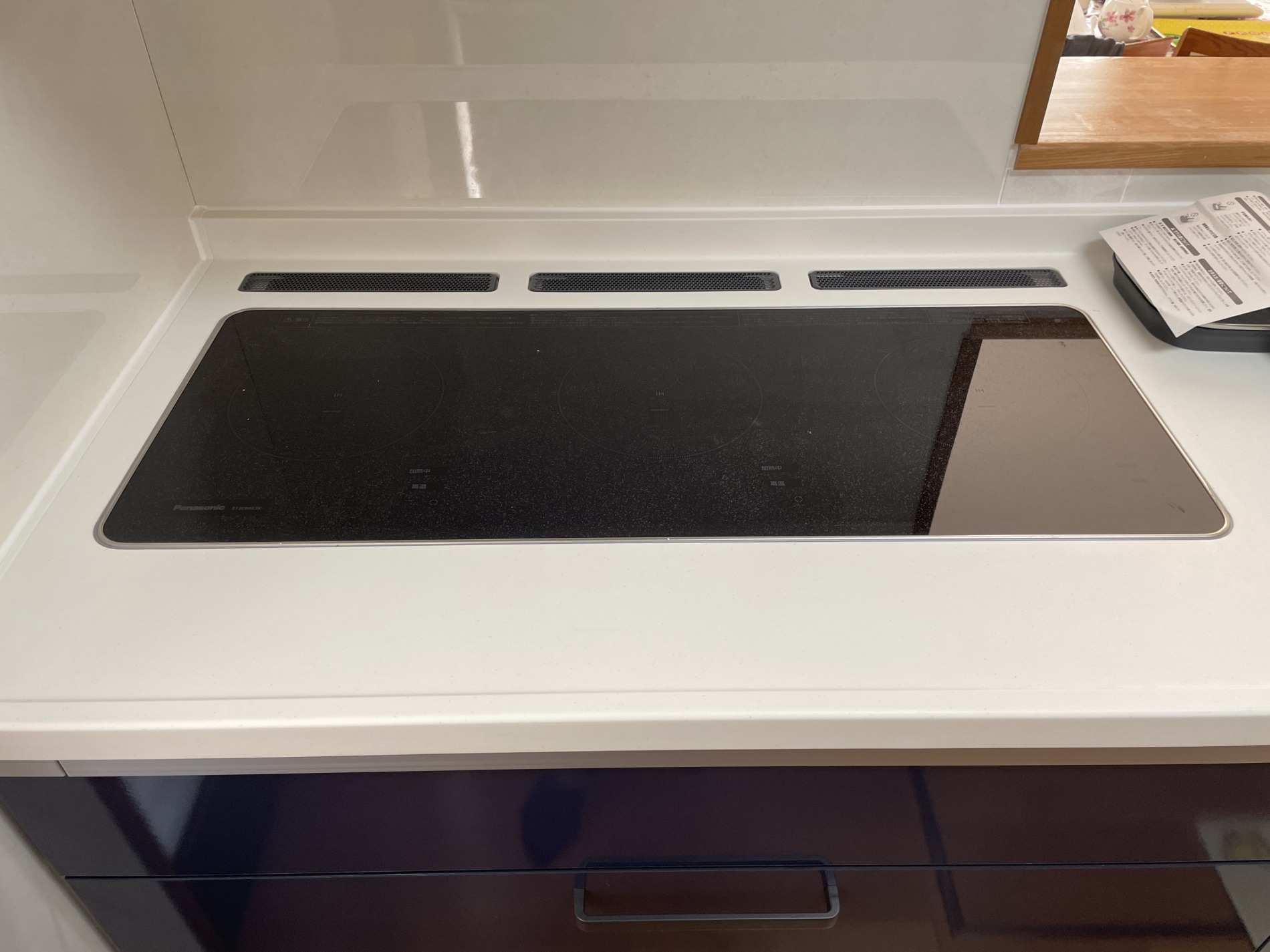「トリプルワイドIHコンロ」は、段差が小さくお掃除しやすい!グリルレスを選定されました。ボタンは収納タイプで、使用しない時は隠れています。ボタンも汚れず安心ですね!